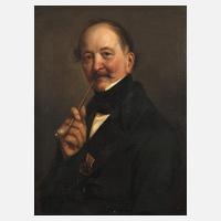Brustbildnis eines Herrn in mittleren Jahren im Mantel mit ordengeschmückter Brust, verschmitzt zum Betrachter blickend, ein Pfeifchen schmauchend, möglicherweise Selbstportrait des Künstlers (vgl. beigegebene Kopie eines Fotos des Künstlers von ca. 1860), lebensnahe, fein lasierende Portraitmalerei, Öl auf Leinwand, rechts unten ligiert signiert und datiert "WDürr 1849", Craquelure, restauriert, gering restaurierungsbedürftig, im alten Goldstuckrahmen, Falzmaße ca. 62 x 47 cm. Künstlerinfo: dt. Portrait-, Genre- und Historienmaler, Glasfensterentwerfer, Graphiker und Illustrator (1815 Villingen im Schwarzwald bis 1890 München), ab 1830 Studium an der Akademie Wien, hier beeinflusst von Josef Danhauser, Peter Fendi und Johann Matthias Ranftl, anschließend bis 1836 Atelierschüler bei Leopold Kuppelwieser, dann kurzzeitig in Villingen freischaffend, 1839 sowie 1840-42 Studienaufenthalte in Rom mit Besuchen von Venedig und Bologna, in Rom Mitglied der "Ponte-Molle-Gesellschaft" und Anschluss an die deutsche Künstlergruppe um Franz Ittenbach, Karl Müller, Ernst Deger, Andreas Müller, Johann Martin von Wagner, Johann Christian Reinhart, Carl Rahl und August Riedel, in Rom beeinflusst von Bertel Thorvaldsen und vom führenden Nazarener Friedrich Overbeck, krankheitsbedingt 1843 Rückkehr nach Baden, ab 1843 als Kirchenmaler in Freiburg im Breisgau tätig, in Erinnerung an die römische Zeit 1847 Gründung einer "Ponte Molle-Gesellschaft" in Freiburg, 1852 Ernennung zum badischen Hofmaler, 1874 Ehrung mit dem Ritterkreuz 1. Klasse vom Zähringer Löwen, 1887 Umzug zum ebenfalls als Maler in München tätigen Sohn Wilhelm Dürr dem Jüngeren (1857-1900), Quelle: Thieme-Becker, AKL, Saur "Bio- Bibliographisches Künstlerlexikon", Müller-Singer, Seubert, Müller-Klunzinger, Boetticher und Wikipedia.