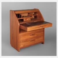 Hersteller Langeskov Dänemark, 1980er Jahre, Teakholz massiv, dreischübiger Korpus, ausziehbare Arbeitsplatte mit automatisch öffnendem Rolloverschluss, unter der Schreibplatte flache Schublade für Briefpapier etc., braune Lederbespannung fleckig, sonst guter Zustand mit normalen Gebrauchsspuren, originale Rechnung über 5000 DM dabei, Maße 102 x 84 x 48 cm.