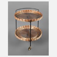 1970er Jahre, ungemarkt, Zarge mit Aufkleber, "Form und Gestaltung durch nationale und internationale Hinterlegung geschützt", schweres verchromtes Gestell mit abgerundeten Ecken, zwei eingelegte, grau gefärbte Glasplatten, auf vier Rollen gelagert, normale Gebrauchsspuren, Maße 41 x 81 x 51 cm.