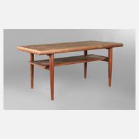 Dänemark, um 1960, Teakholz massiv, rechteckige Platte mit leicht gewölbter Zarge, darunter kleine Zeitungsablage, Alters- und Gebrauchsspuren, Maße 52 x 117 x 53 cm.