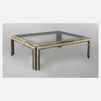 1970er Jahre, verchromtes Metallgestell mit klassizistischen Motiven verziert, eingelassene Scheibe aus Klarglas, Oberfläche zaponiert, Maße 44 x 137 x 66 cm.