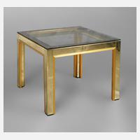 Mitte 20. Jh., Gestell aus massivem Messing, mit lose eingelegter Holz- bzw. Glasplatte, die Beine mit kannelierten Rundsäulen, die Zierleisten ebenfalls kanneliert, Alters- und Gebrauchsspuren, Maße je 54 x 69 x 44 cm.