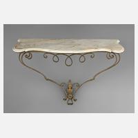 Italien, 1950er Jahre, flache Konsole aus goldbronziertem Schmiedeeisen mit originaler Marmorplatte, Kunstschmiedearbeit, normale Alters- und Gebrauchsspuren, Maße 94 x 124 x 26 cm.