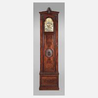 Ende 19. Jh., auf reich graviertem Messingziffernblatt signiert, Werk mit zwei Gewichten, Halbstundenschlag auf Tonfeder, dreiteiliges Gehäuse aus massiver Eiche, reich beschnitzt, eine Zierleiste lose beigegeben, gering rest.bed., funktionsfähig, Maße 235 x 66 x 36 cm.