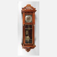 deutsch, um 1900, auf dem Werk gemarkt Junghans, Gehäuse aus massivem Nussbaum mit versilberten Beschlägen und facettgeschliffenen Scheiben, versilbertes Ziffernblatt mit arabischen Zahlen, Halbstundenschlag auf Tonfeder, restauriert, funktionstüchtig, H 35 cm.