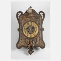 deutsch, um 1900, rückseitig undeutlich gemarkt, Wanduhr mit teils vollplastisch gegossenen Jagdmotiven, farbig patiniert und goldbronziert, Messingplatinenwerk mit Halbstundenschlag auf Tonfeder, funktionstüchtig, guter Zustand, H 56 cm.