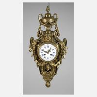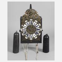 Frankreich, 18. Jh., auf geschwärztem Eisengehäuse montiertes prächtiges Ziffernblatt aus Messing mit durchbrochen gearbeiteter Bekrönung, darin figürliche Darstellungen mit Maskaron, musizierenden Mischwesen und Putten sowie ein Hahn, Emaillekartuschen mit blauen römischen Zahlen und Minuterie, mittig Weckerscheibe, originale Eisenzeiger, zwei Eisengewichte, Halbstundenschlag auf Glocke, Spindelhemmung, Werk überholt und gehfähig, eine kleine Emaillekartusche restauriert, eine Kartusche mit Fehlstelle, Pendel fehlt, Maße: 34 x 21 x 13 cm.