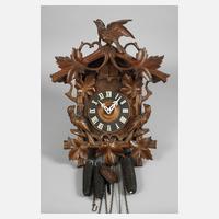 1. Hälfte 20. Jh., fein geschnitztes Holzgehäuse mit Weinlaub und drei Wachteln verziert, Messingwerk mit Viertelstundenschlag auf zwei Tonfedern, Kuckuck und Wachtelruf mit drei Pfeifen, bis auf den Wachtelruf funktionstüchtig, Schnitzerei mit minimale Fehlstellen, Zeiger und eine Tür ergänzt, etwas rep.bed., H 50 cm.
