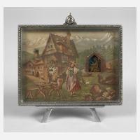 Schweiz, um 1920, gemarkt La Belle Aubergiste Fab. Suisse, fein ausgemalte alpenländische Szene mit junger Bauersfrau vor gedecktem Tisch, rechts unten signiert DUMER, als Staffelei gearbeitetes vernickeltes Metallgehäuse mit facettgeschliffener Scheibe, rückseitig zwei separate Uhrwerke, eines davon zum Antrieb des Automaten "pfeilschmiedender Amor", im Hintergrund sich drehendes Windmühlenrad, funktionstüchtig, Z 2, Maße 11 x 10 cm.
