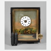 Schwarzwald, 2. Hälfte 19. Jh., gemarkt „Fürderer Jaegler & Cie.“, Holzplatinenwerk mit Halbstundenschlag auf Tonspirale, Front mit handgemalter Darstellung eines Tigers in Öl auf Blechtafel, bewegliche Glasaugen, makelloses Emailleziffernblatt mit römischen Ziffern, reinigungsbedürftig, Maße 30 x 24 x 14 cm.