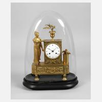 Frankreich, 1. Hälfte 19. Jh., auf der Amphore bezeichnet: "Point de roses sans épines", Werk mit Fadenpendel und Halbstundenschlag auf Glocke, fein graviertes Gehäuse aus Bronze feuervergoldet, verziert mit einer jungen Dame, Turteltauben und einer Amphore mit Rosenstrauch, im Sockel Putten mit Festons, ein Rosenzweig und zwei Pfeilspitzen fehlen, sonst guter funktionstüchtiger Zustand, mit Sockel und Glassturz, H gesamt 45 cm.