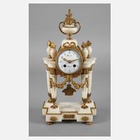 Frankreich, um 1900, feine neoklassizistische Säulenuhr, auf dem emaillierten Ziffernblatt signiert Muret, das Gehäuse reich verziert mit vergoldeten Bronzeappliken, Festons und Girlanden, die Pendellinse in Form eines Blütenkorbs, Pendulenwerk mit Halbstundenschlag auf Glocke gemarkt Vincent & Cie., Werk läuft kurz an, H 38 cm.