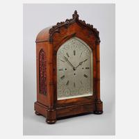 England, 19. Jh., reich verziertes Nussbaumgehäuse im gotischen Stil, von gedrechselten Rundsäulen flankiert, die Bekrönung fein geschnitzt, auf dem Ziffernblatt und der Werkplatine gemarkt W. Johnson – Strand – London, mächtiges Werk mit Graham-Ankerhemmung, drei Federhäuser mit Antrieb über Kette, arretierbares langes Pendel mit massiver Messinglinse, Viertelstundenschlag auf Carillon mit acht Glocken, jeweils mit vier unterschiedlich langen Melodien (abschaltbar), zur vollen Stunde zusätzlich Schlag auf die große Glocke, Repetition über Fadenzug, voll funktionstüchtig, guter Zustand, mit zwei Schlüssel, H 59 cm.