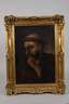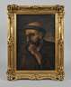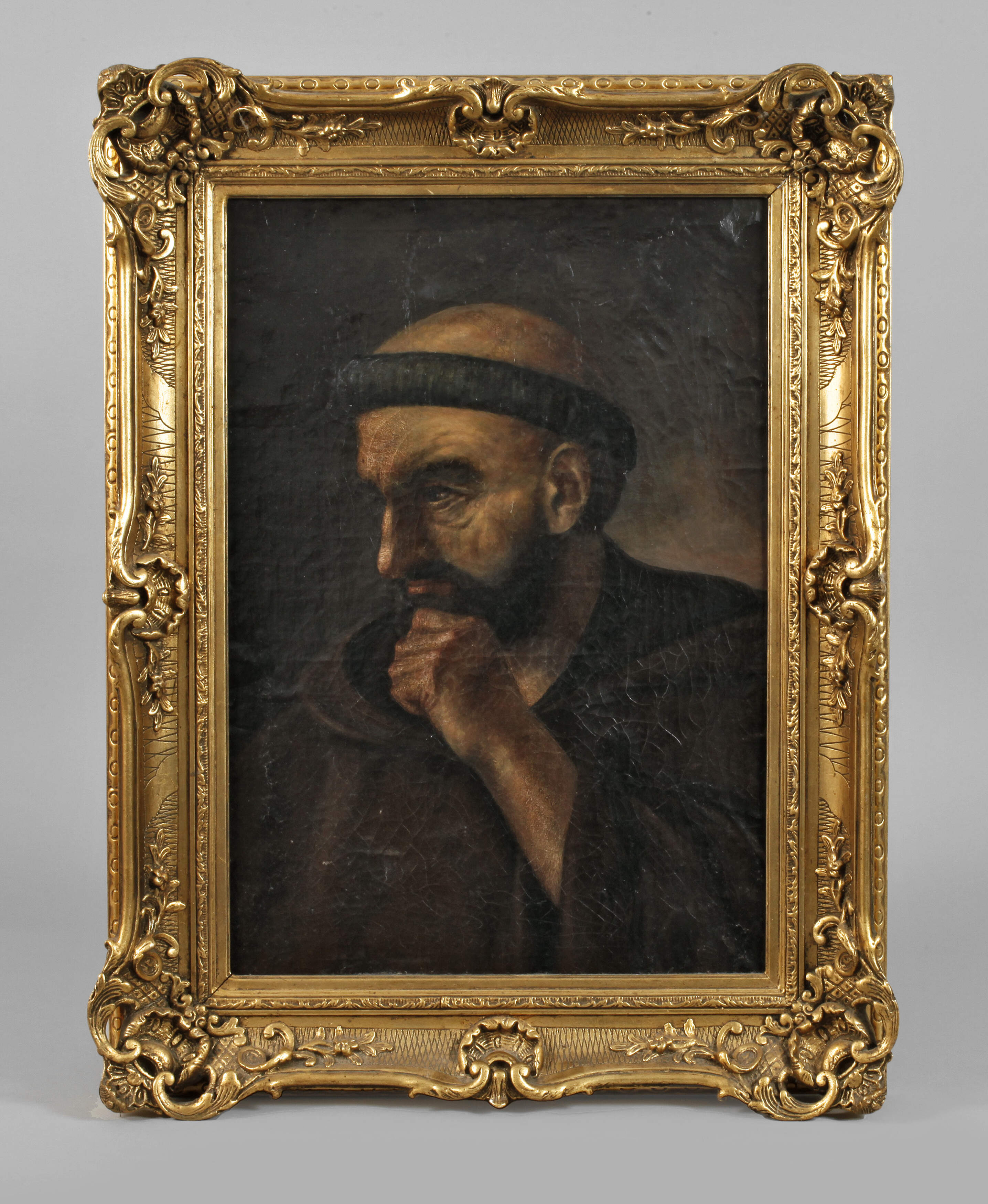 Brustbildnis eines älteren Mannes mit Tonsur und braunem Habit im Profil vor dunklem Grund, nachdenklich sein Kinn auf seine linke Hand stützend, gering pastose Bildnismalerei, Öl auf Leinwand, 18./19. Jh., unsigniert, Craquelure, doubliert, retuschiert, im prächtigen, ca. 8,5 cm breiten Goldstuckrahmen, Falzmaße ca. 56 x 38 cm.