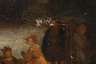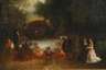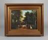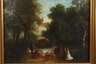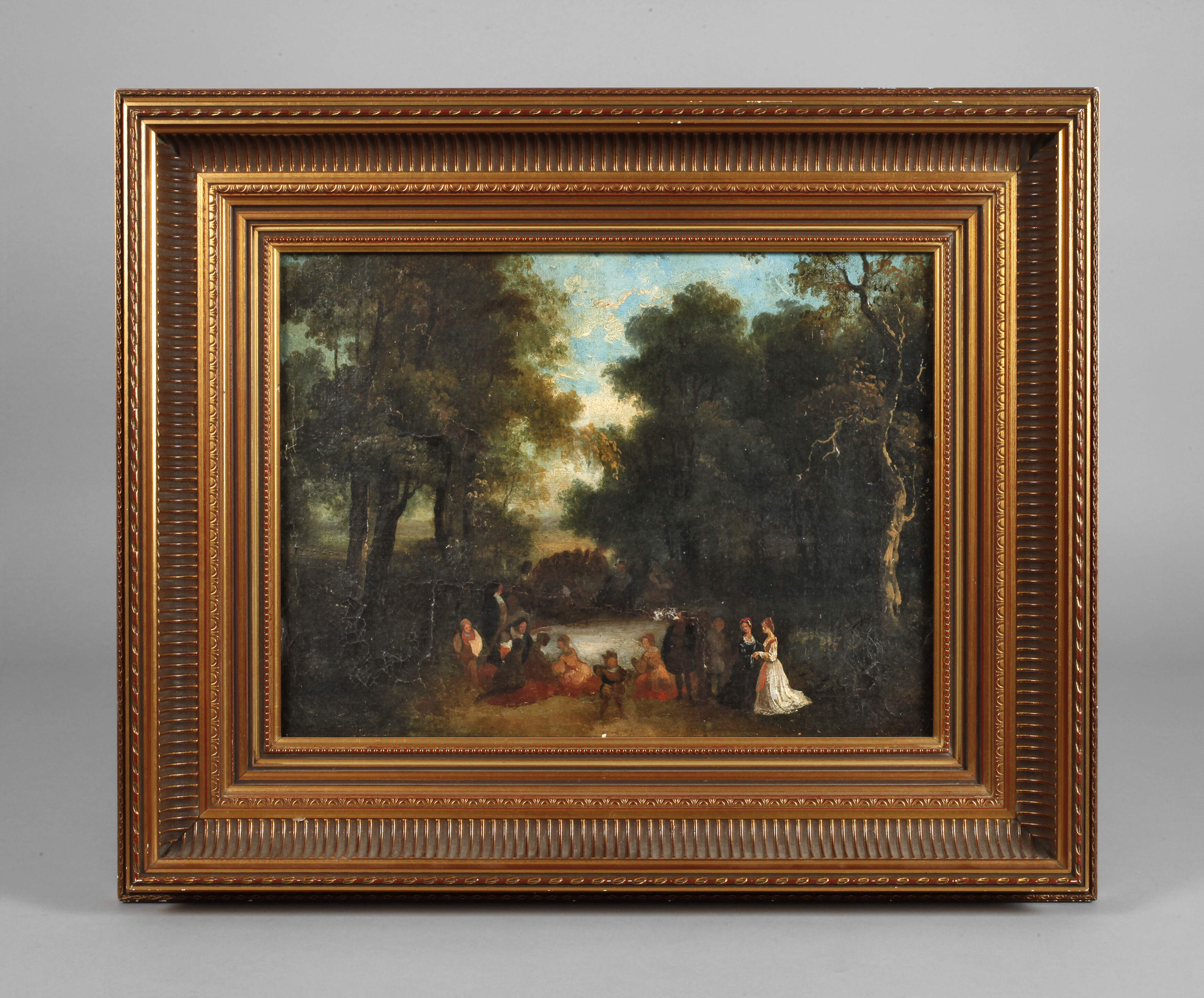 sommerliche Waldlandschaft mit Teich und am Ufer rastender Gesellschaft, pastose Genremalerei, Öl auf Leinwand, 18. Jh., unsigniert, Craquelure, alt doubliert, Retuschen, alter Spannrahmen holzwurmstichig, etwas restaurierungsbedürftig, in Goldleiste gerahmt, Falzmaße ca. 32 x 40,5 cm.