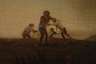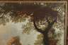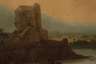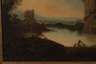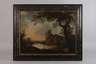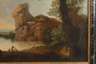 von Bäumen und Felsen umgebener See, mit einer Burg auf einem Felsen am Wasser und eine Gruppe von Männern, welche einen Kahn aus dem Wasser ziehen, weite Ideallandschaft, getaucht in das Licht der untergehenden Sonne, 18. Jh., doubliert, dezentes Craquelure, im Randbereich kleiner Verlust der Farbschicht, etwas restauriert, etwas restaurierungsbedürftig, gerahmt (nicht aus der Zeit und etwas berieben), Falzmaße ca. 64,5 x 84 cm.