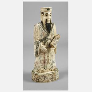 1. Hälfte 20. Jh., am Boden mit geritzter Vier-Zeichen-Marke, aus verschieden großen Beinsegmenten gefertigte Standfigur, teils beschnitzt, graviert und mehrfarbig gefasst, vollplastische Darstellung eines Glücksgottes mit Attribut, Altersspuren, H 21 cm.