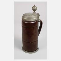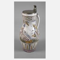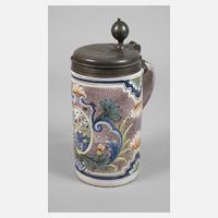 datiert 1749, rötlicher Fayencescherben, handabgedreht, am Boden altes Sammlungsetikett, zylindrische Form, weiß glasiert, mangangeschwämmelt und mit bunten Scharffeuerfarben bemalt, florale Kartusche mit Vogelmotiv, Zinnmontierung bestehend aus Lippenrand und übergreifendem Deckel mit großer Kugel, Henkel ebenfalls mit Zinnband belegt, Besitzermonogramm S.F.Ch., Kugelansatz eingerissen, Lippenrand gedellt, Korpus im guten altersgemäßen Zustand, H 27 cm.