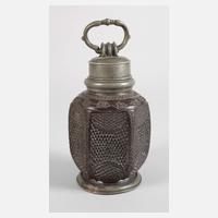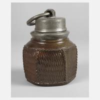 Muskau-Triebel, um 1660/80, schwarzbraunes Steinzeug mit Braunstein-Engobe und Salzglasur, Sinterbrand, sechsseitig abgeflacht, auf der Schulter eine gestempelte Blütenreihe, auf der Wandung feines Netzwerk, horizontale und vertikale Blattbänder, Zinnmontierung bestehend aus originalem Standring, Mündungsrand und Schraubdeckel mit klappbarem Griff, dieser gedellt, sonst altersgemäß sehr guter Zustand, H komplett mit Griff 19 cm. Quelle: Josef Horschik, Steinzeug 15.–19. Jh., S. 471 ff..