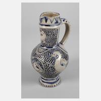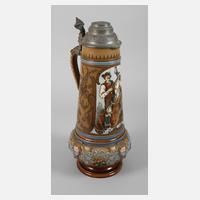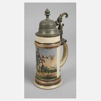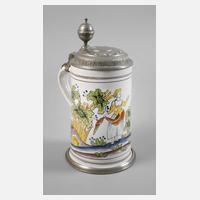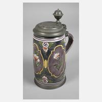 wohl Ende 19. Jh., dunkelbrauner Scherben, braun glasiert und mit bunten Muffelfarben bemalt, datiert 1675, reliefierte Darstellung der zwölf Apostel, mittig Wappen mit Löwen, am Henkel Tierkopf, umlaufend Ornamentband und Gurtfurchen, Zinndeckel, partiell Farbfehlstellen, sonst unbeschädigter, guter Zustand, H 21,5 cm.
