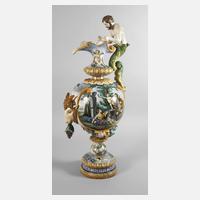 Ende 19. Jh., Werkstatt Gaetano Battaglia Neapel, signiert und bezeichnet N c, im Urbinostil, rötlicher Scherben mit feiner Malerei, Schlangenhenkel, abnehmbarer Deckel, mythologische Szenen mit Hermes und Kamelbändigern, Fuß mehrfach gebrochen und geklebt, ein Henkel fehlt, H 65 cm. Info: Dieser Artikel kann nur mit einer Spedition versendet werden!