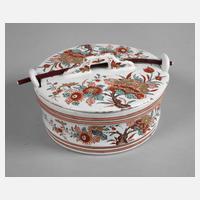 1721, monogrammiert, am Boden mit roter Pinselnummer 80, innen blaue Pinselnummer 2i und Deckel VA 23, heller Fayencescherben weiß glasiert, feine florale Malerei in Rot- und Grüntönen, partiell schwarz konturiert und vergoldet, runde Form mit hochgezogenen Ösenhenkeln, flacher Deckel mit abgekantetem Knauf, Stand und Mündungsrand mit je einem kleinen Oberflächenchip, sonst guter altersgemäßer Zustand, D 11,5 cm. Quelle: Friedrich Jaennicke, Marken und Monogramme auf Fayence, Porzellan, Steinzeug und sonstigen keramischen Erzeugnissen, Verlag Paul Neff, Stuttgart 1878, S. 54, Nr. 1494, sowie S. 95.