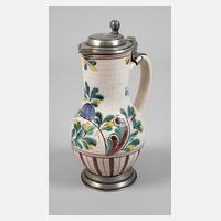 Ende 18. Jh., rötlicher Fayencescherben handabgedreht, unleserliche gepinselte Bezeichnungen, bläulich-weiße Glasur mit kobaltblauer floraler Bemalung, der Henkel mit Volutenmotiven verziert, Zinndeckel mit kurzem Drücker und spitzer Schnaupe, gewellter Henkelansatz, dort kleinere oberflächliche Fehlstellen, am Mündungsrand und Stand ebenfalls winzige Glasurfehlstellen, insgesamt guter altersgemäßer Zustand, H 28 cm.
