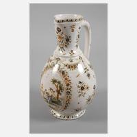 Niederösterreich, 1. Hälfte 19. Jh., rötlicher Fayencescherben mit weißer Glasur, bemalt mit Scharffeuerfarben, schauseitig Motiv Hirsch und Hund, seitlich Blütenranken, Streifenbänder, Henkel mit eingerolltem Abschluss, übergreifender Zinndeckel mit Perlband verziert, kleine Glasurabplatzer und Gebrauchs- sowie Altersspuren, H 26,5 cm.