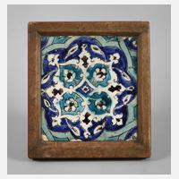 wohl 16./17. Jh., graues Steinzeug, in Blautönen und Violett ornamental bemalt, schwarz konturiert, später als Tablett in Eichenfassung eingelegt, oberflächliche Fehlstellen und Kratzspuren, Maße gesamt 5 x 25,5 x 29 cm.