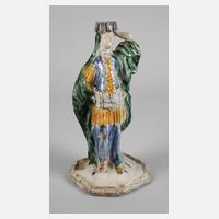 19. Jh., ungemarkt, beiger Scherben farbig glasiert, auf oktogonaler Plinthe mittig stehende, halbplastisch ausgeformte Frau im orientalischen Gewand, die kronenähnliche Kopfbedeckung mit kleiner kreisrunder Vertiefung, wohl Steckverbindung für eine Schale oder Kerzenhalter, Brandfehler und Glasur partiell bestoßen, H 27 cm.