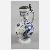 Anfang 18. Jh., hellgrauer Fayencescherben mit kleisterblauer Glasur und kobaltblauer feiner Bemalung, schräg gerippt, mit geflochtenem Henkel, Zinnmontierung bestehend aus Standring und übergreifendem Deckel mit großer Kugel, winzige Glasurfehlstellen an der Schnaupe und am Henkelansatz, H 36 cm.