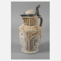 grüne Stempelmarke 1874-1918, Prägenummer 6. und 32., Feinsteinzeug mit seladon- und cremefarbener Unterglasurbemalung, balusterförmige Kanne mit Henkel, Schnaupe und üppigen Reliefauflagen aus Weinranken mit Vögeln, drei großen figürlichen Kartuschen (Noah mit Weinstock, Germania, König David an der Harfe), umlaufendem Spruchband "Wer nicht liebt Wein, Weib, Gesang - der bleibt ein Narr sein lebenlang. Wohl bekommt's!" sowie zinngefasstem Deckel, Hals am Henkelansatz mit durchgehenden Haarrissen, sonst guter Zustand, H 33,5 cm.