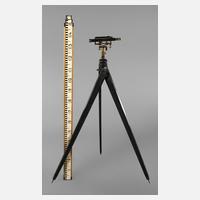 2. Hälfte 19. Jh., gemarkt Starke & Kammerer Wien sowie nummeriert 1436, Messgerät aus Messing auf ebonisiertem Holzstativ, Gerät und Nivellierlatte in originalen Holzetuis, Alters- und Gebrauchsspuren, H 130 cm, L Etui 160 cm.