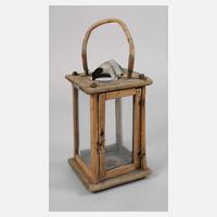 Anfang 20. Jh., Gehäuse aus Nadelholz, vierfach verglast, mit scharnierter Front, gebogter Bügelhenkel, Metallmontierungen, starke Alters- und Gebrauchsspuren, H 36 cm.