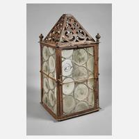 17./18.Jh., Schmiedeeisen mehrteilig verschraubt, Tür mit Scharnier und Verschluss mit Federmechanismus, drei Seiten mit alten mundgeblasenen Butzenscheiben verglast, das Dach ornamental durchbrochen gearbeitet, eine Scheibe fehlt, Korrosionsspuren, zwei Butzenscheiben mit Haarriss, rest.bed., H 48 cm.