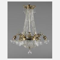 1. Hälfte 20. Jh., vergoldetes Gestänge aus getriebenem, teils massivem Messing, als Sacklüster gestaltetes Modell aus zahlreichen Strängen facettierter Klarglassegmente mit reichem Behang aus Prismen und Tropfen sowie vereinzelte Sternmotive, der zentrale Ring gesäumt von sechs kurzen, s-förmig geschwungenen Leuchterarmen, insgesamt neunflammig elektrifiziert, kleinere Substanzverluste, Altersspuren, H ca. 90 cm, D ca. 80 cm.