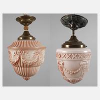 um 1925, getriebene Gehäuse aus Messingblech mit abgehängten balusterförmigen Schirmen, diese im Model formgeblasen und nachträglich in Spritztechnik akzentuiert, etwas restaurierungsbedürftig, H je ca. 40 cm.