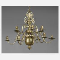 19. Jh., Bronze massiv, mehrteilig gegossen und montiert, profilierter Balusterkorpus mit insgesamt zwölf auf zwei Ebenen montierten, s-förmig geschwungenen Leuchterarmen, welche jeweils eine Kerzentülle tragen, bekrönt von Volutenmotiven und graviertem Doppeladler, nicht ganz komplett, H ca. 65 cm, D ca. 65 cm.