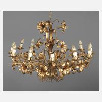 wohl Italien, Mitte 20 Jh., floral gestalteter zwölfflammiger Lüster aus Eisenblech bronziert, alt elektrifiziert, Funktion nicht geprüft, zwei Glühlampen fehlen, H 125 cm, D 110 cm.