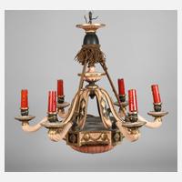 19. Jh., Holz geschnitzt, teils gestuckt, farbig gefasst und partiell goldbronziert, passig geschweiftes Gehäuse, verziert von klassizierenden Reliefs, mit sechs s-förmig geschwungenen, in Form von Füllhörnern gestalteten Leuchterarmen, welche jeweils eine Kerzentülle tragen, mit insgesamt sechs nachträglichen Brennstellen, Oberfläche mit Alters- und Gebrauchsspuren, etwas restaurierungsbedürftig, H ca. 45 cm, D ca. 60 cm.