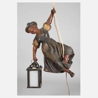 Ende 19. Jh., Holz geschnitzt und farbig gefasst, plastisch in Form eines jungen Bauernmädchens gestalteter Ausleger, in ihrer Hand eine angehängte Lampenfassung mit geschnitzter Laterne, diese vierfach verglast, ein Segment fehlt, Elektrik rest.bed., Alters- und Gebrauchsspuren, H ca. 55 cm.