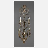 Frankreich, Anfang 20. Jh., Bronze und Messing, mehrteilig gegossen und montiert, in klassizierender Formsprache gestaltete Appliken in Form zweier Fackeln, verbunden durch Feston und Schleifenband, satinierte, im Model formgeblasene Klarglasschirme mit bronzenem Überfang, Alters- und Korrosionsspuren, Elektrik reparaturbedürftig, H je ca. 60 cm.