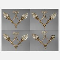 um 1915, Bronze vergoldet, als Füllhörner gestaltete Ausleger, jeweils vier s-förmig geschwungene Leuchterarme tragend sowie zentrale zusätzliche Tülle, insgesamt jeweils fünfflammig elektrifiziert und von Klarglasprismen gerahmt, Alters- und Gebrauchsspuren, H je ca. 65 cm.