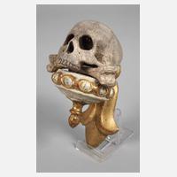 19. Jh., Holz geschnitzt, kreidegrundiert, farbig gefasst und vergoldet, Miniaturkonsole mit plastischem Totenschädel, kleine Fehlstelle, H 15 cm.