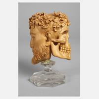 20. Jh., Laubholz aufwendig beschnitzt, vollplastische Darstellung eines Männerhauptes, frontseitig in der Blüte seines Lebens, auf der Kehrseite jedoch nur noch als Totenschädel, auf facettiertem Glassockel montiert, H ges. 12 cm.