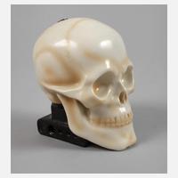 1. Hälfte 20. Jh., ungemarkt, Porzellan in Aufglasurbemalung, plastischer Totenschädel auf durchbrochen gearbeitetem Podest, die Schädelkalotte mit weiteren kleinen kreisrunden Öffnungen neben mittigem Messingeinsatz zur Aufnahme eines Gegenstandes (Stift oder Kienspan), wohl ehemaliger Rauchverzehrer (ohne Elektrik), winzigster Farbabrieb am Sockel, H 11,5 cm.
