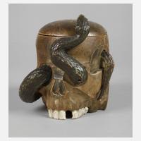 Anfang 20. Jh., Laubholz, mehrteilig geschnitzt und farbig gefasst, Korpus in Form eines von einer Schlange umwundenen Totenschädels gestaltet, Kauf fehlt, sonst nur leichte Altersspuren, H ca. 12 cm.