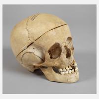 unbestimmten Alters, Fragment eines Kinderschädels, welcher mittig geteilt und handschriftlich beschriftet wurde, als medizinisches Anschauungsmodell, fragmentarische Erhaltung, L ca. 16 cm.