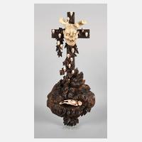 20. Jh., Laubholz beschnitzt, dunkel gefasst sowie Horn ebenfalls aufwendig bearbeitet, von Efeu umranktes Kruzifix, welches von etlichen Totenköpfen geziert wird und in dessen Zentrum ein Satanenhaupt prangt, im Bereich der Predella findet sich ein freigelegtes menschliches Skelett, gute Erhaltung, H 34 cm.