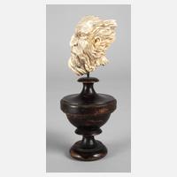 19. Jh., Hirschhorn beschnitzt, Januskopf, welcher vermutlich den Feuergott der nordischen Mythologie Loki zeigt, auf gedrechseltem, dunkel gefasstem Laubholzsockel, Altersspuren, H 15 cm.